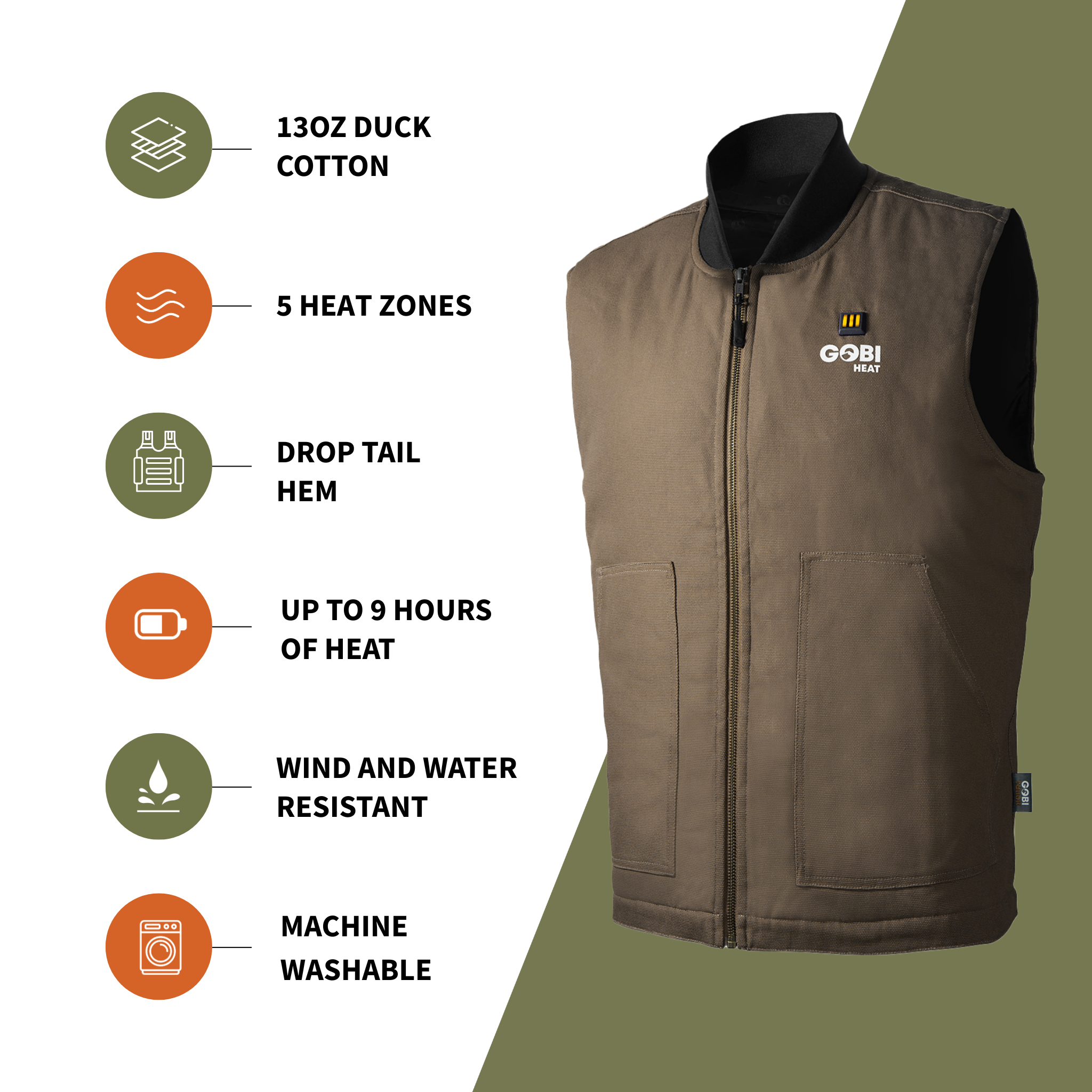 Boasting up to 9 hours of heat with our New Quick-Charge Multi-Voltage Battery, this men’s heated work vest is built for extreme durability and warmth on the jobsite, ranch, or farm.  It is the warmest heated workwear vest on the market. Plus, it’s wind and water resistant and features 5 heat zones (2 zones in the chest, 2 zones in the abdomen, and a large zone in the back), ensuring you warm up in time to meet the demands of your work.
