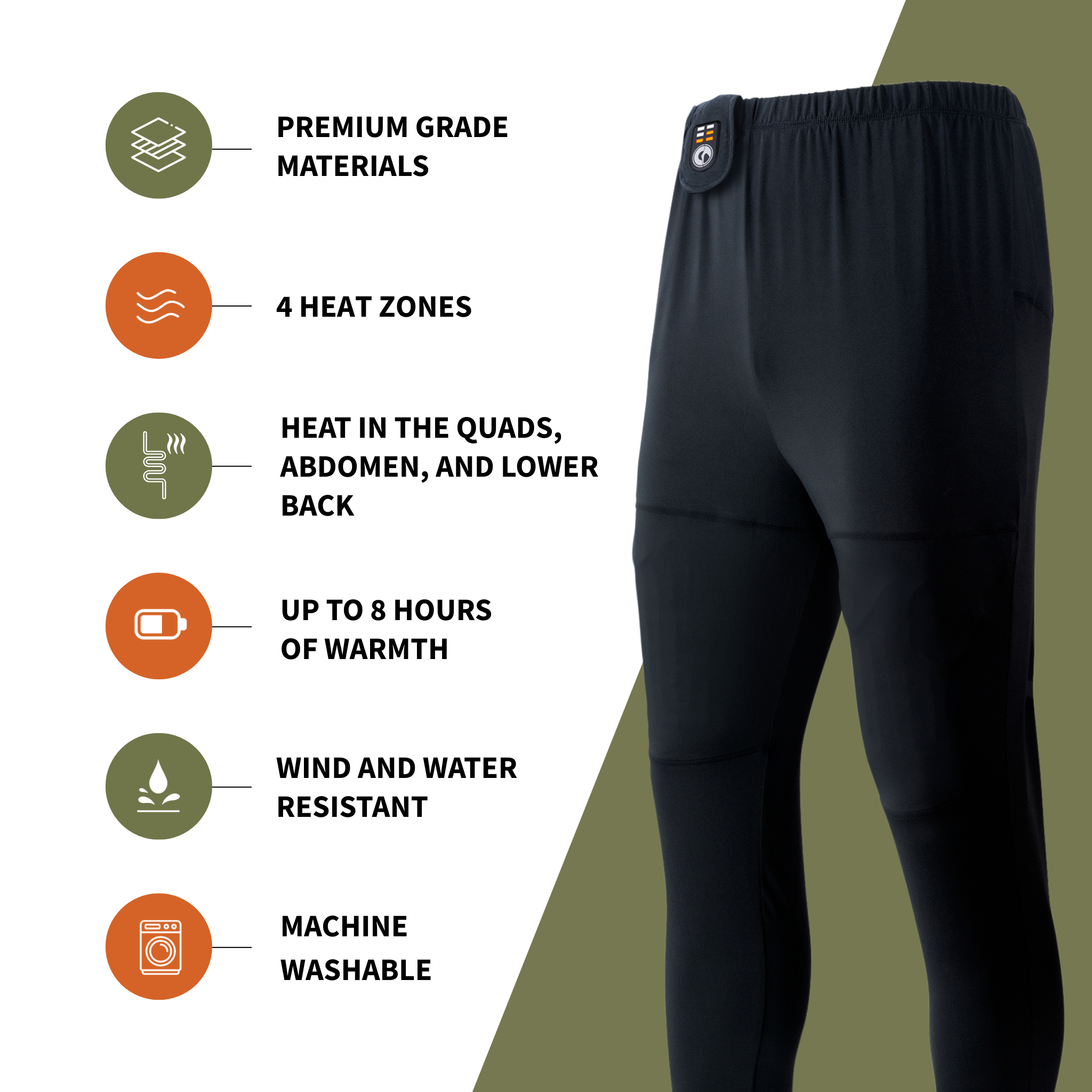 With heat zones in the quads and glutes, you are heating up your core muscles increasing circulation, keeping yourself warm even in the harshest conditions.