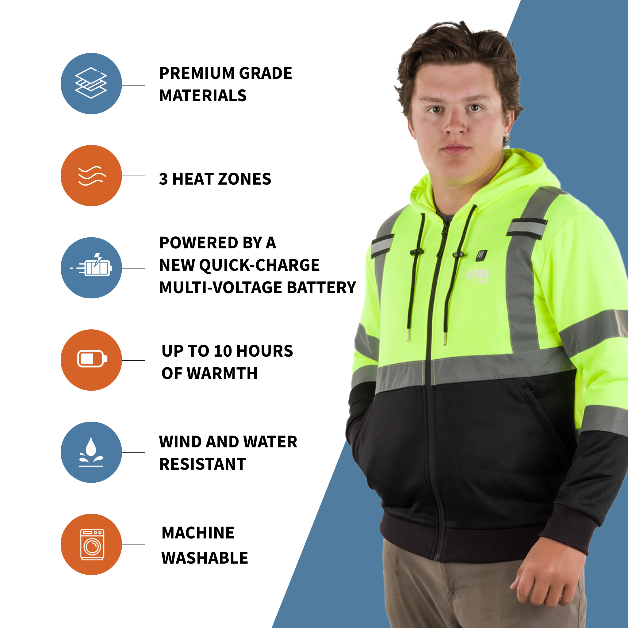 Introducing the Beam Men’s High-Vis Heated Hoodie—built for men who need warmth, comfort, and visibility on the job. With just a push of a button, activate the conductive thread heating technology powered by a New Quick-Charge Multi-Voltage Battery, delivering up to 10 hours of heat. Featuring two heating zones in the front and a large heating zone in the back, this hoodie keeps you warm and visible in demanding work environments.