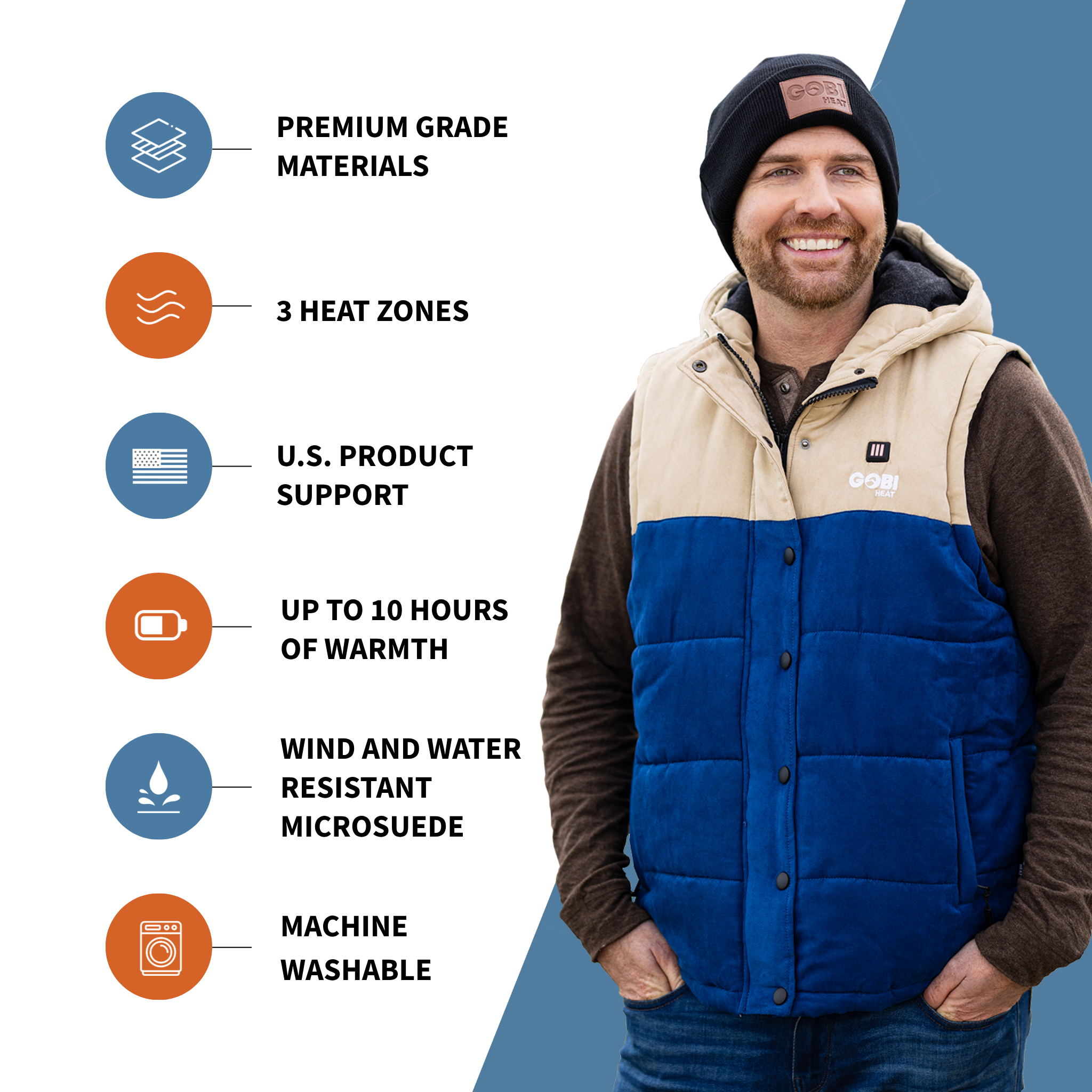 The Colt Vest is Gobi Heat’s most feature-rich—and trend-forward—vest yet. Designed with a thick puffer build and a timeless two-toned look, the Colt blends retro style with modern warmth. Its microsuede outer shell comes in Shoreline, a deep blue and cream combination that feels both classic and fresh.