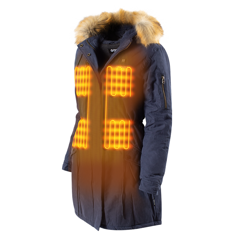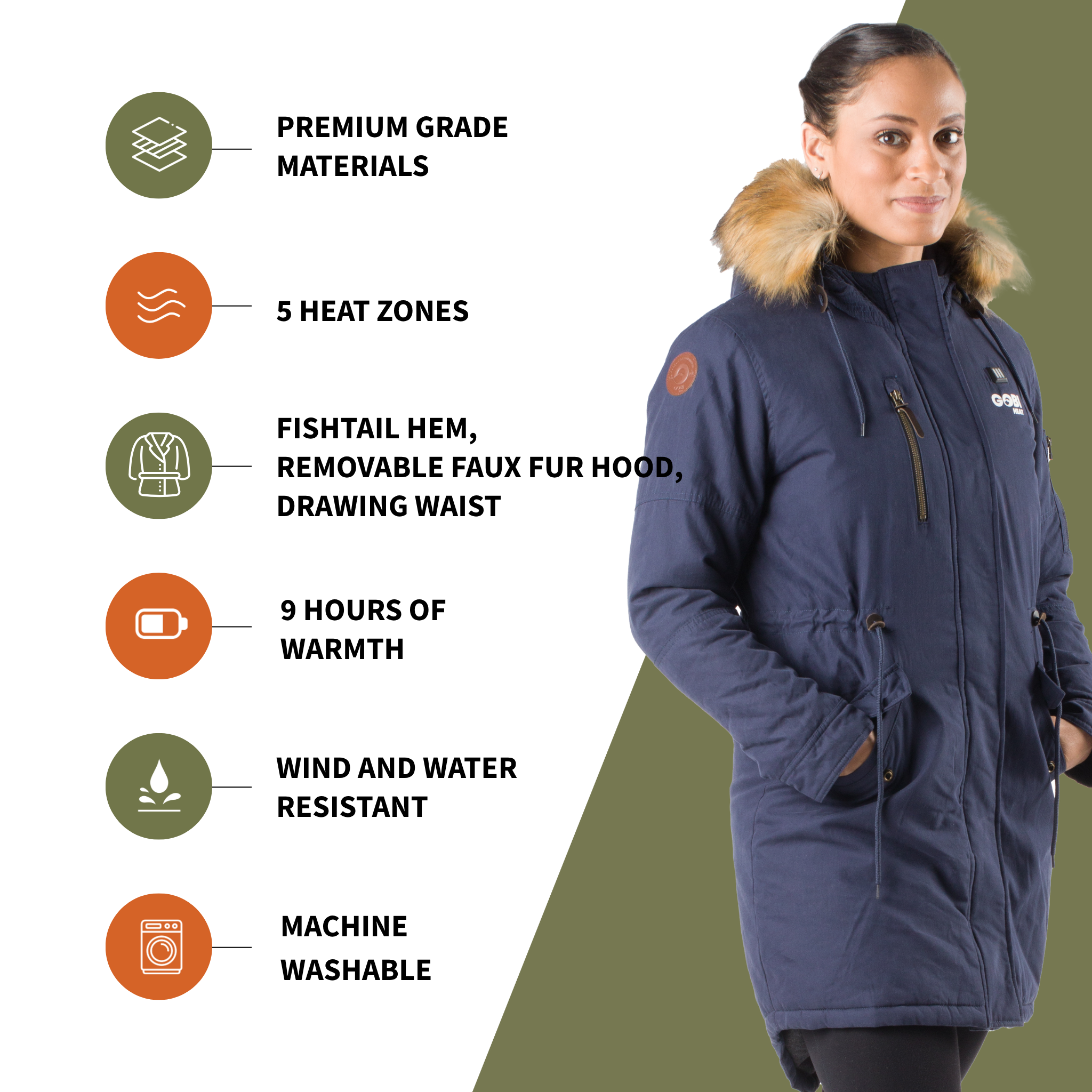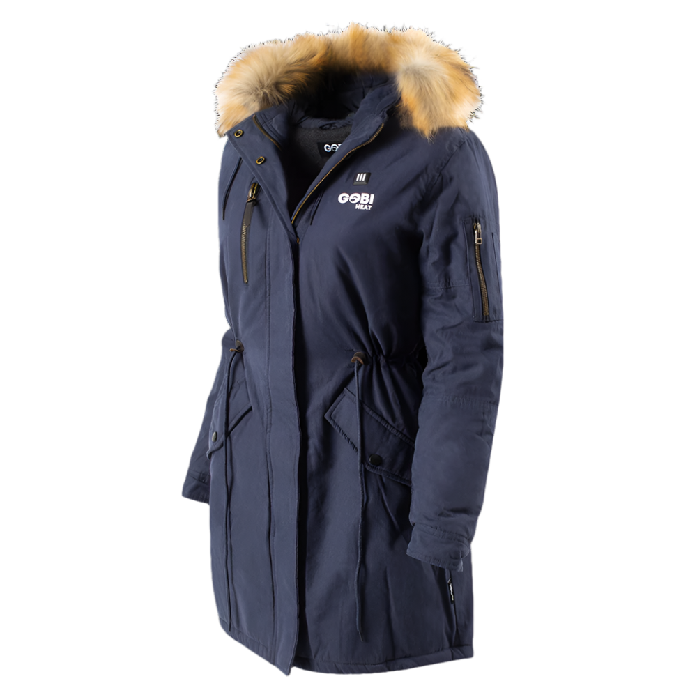 The Terra Heated Parka brings together the best features of Gobi Heat’s extensive women’s jacket line into one stylish option. This long women’s winter jacket comes equipped with materials and features meant to keep you warm in any situation – and it is our first long-coat design. Offered in Navy, the Terra Parka from Gobi Heat features a drawstring hood with removable faux fur. The flannel inner lining will keep you cozy in the cold, while the outer shell is perfect for protecting against winter elements. The fishtail hem in the back is what sets the Terra apart and allows for more complete body coverage. As always, this jacket comes equipped with Gobi Heat’s conductive threading system that will allow you to control your temperature on the go. The Terra Parka is our most complete style yet. Gear up for the winter months ahead! Now with Gobi's New Quick-Charge Multi-Voltage Battery!